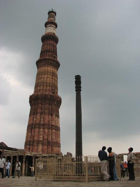 After spending all day yesterday dealing with the madness that is the Delhi rail station, James and I decided to go sightseeing today. We went to see the tallest brick structure in the world at the Qutb Minar complex. They used to let you up the 72 meter spire, until 40 people were trampled to death at the exit. While the minaret is impressive, it was the 7 meter iron pillar that really got our attention. It was forged around 400AD, and is 99% pure. That level of metallurgy wasn’t achieved in the west until the middle ages. This leads James to believe that it is really an alien artifact, a theory that the inscription seems to verify. There is also a 45 meter hole in the ground (measured by our inaccurate spit-timing method). Deep well, or entrance to the hidden tunnel complex? Further exploration is clearly needed. We plan to return with rapelling gear and torches.