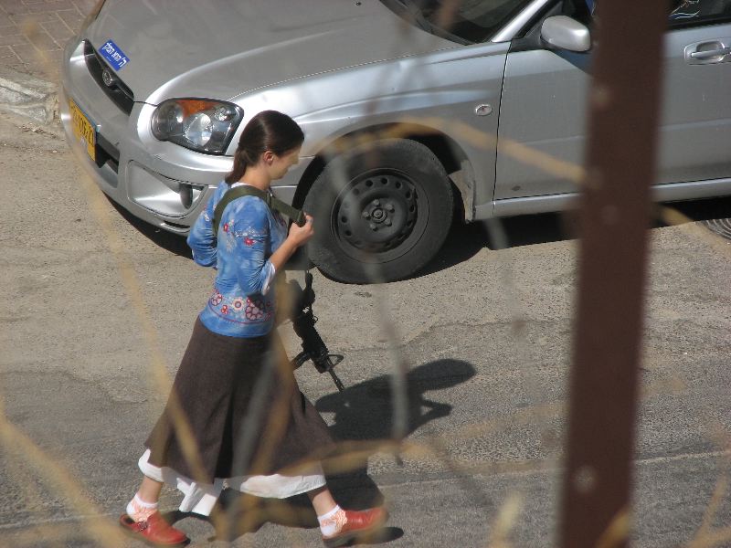 Palestinians are forbidden from using several streets by the settlements, separating children from a school. TIPH observers walk every morning with them for protection. On this road, I saw a young woman nonchalantly carrying a very large automatic weapon. When I asked our guide whether a permit was required for such a gun, she replied “I’ll bet she knows how to use it.” The graffiti covering Palestinian shops and schools shows a new use of the Star of David. From its use to identify Jews in the Holocaust, it is now for these people a symbol of nationalism, and a marking of a different kind.