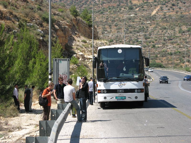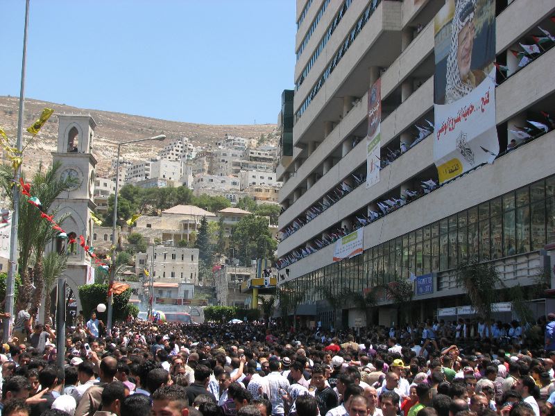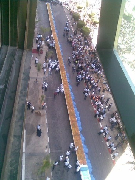Went to Nablus to see the world’s largest knafeh. We got there a little late because our bus broke down, so instead, we got to see a mad crush of people and no knafeh. We didn’t get up the building from which you could actually see the 75 meter long pastry, so I “borrowed” a picture from here.