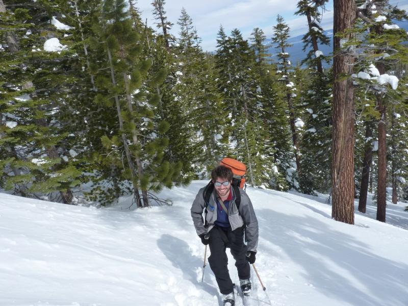 On Sunday we went to Jakes Peak just off Emerald Bay. It’s a classic backcountry run, with a pretty steep skin track right off the bat. I’m a little out of shape, but Chris kept me company in the back. When we got to the top, I was glad to have my new beacon and shovel, as there are several clear avalanche paths. Definitely need that gear out here; and yes Mom, I am going to take a safety course.