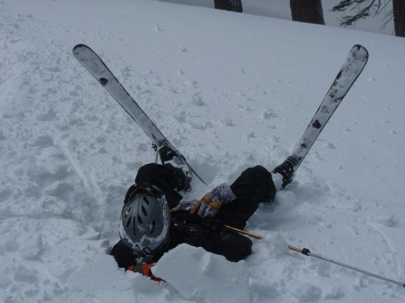 Descending was not as epic as you’d think given the amount of snow. The high winds had done their worst, and the surface was pretty slabby for the top third. The middle was quite nice, and then it got a little heavier at the bottom. Took a few tumbles in the soft snow when I couldn’t keep my weight far enough back. Still, I had a better descent than John, whose rented AT gear malfunctioned and so had to walk/shovel ride down 2000 feet. Better luck next time, Gamble.