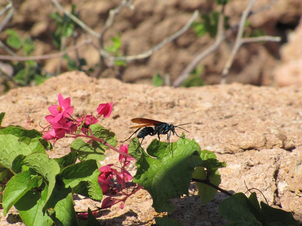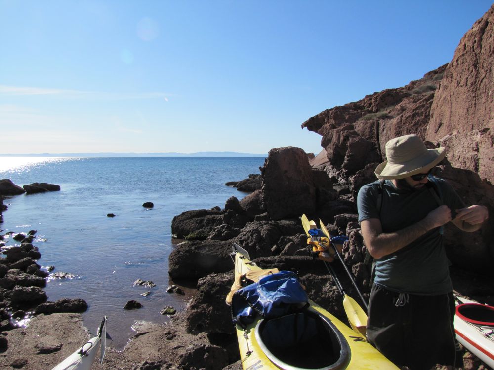 After lunch, we got back in the kayaks and paddled along the coast to a small inlet. We beached ourselves on the rocky shore, and hiked up an arroyo. The landscape is starkly beautiful, but most of the flora and fauna is fairly aggro. As we were hiking, Roman stopped to point out a dried cactus that scorpions like to live in, and a “tarantula hawk” wasp. Also called the Caballo del Diablo, it kills spiders by stinging them with a paralytic, then laying its eggs in it so the young can eat it alive. Apparently its sting is also one of the most painful possible (4 out of 5 on the Schmidt Pain Index). I took a photo with my zoom lens and gave it a wide berth.