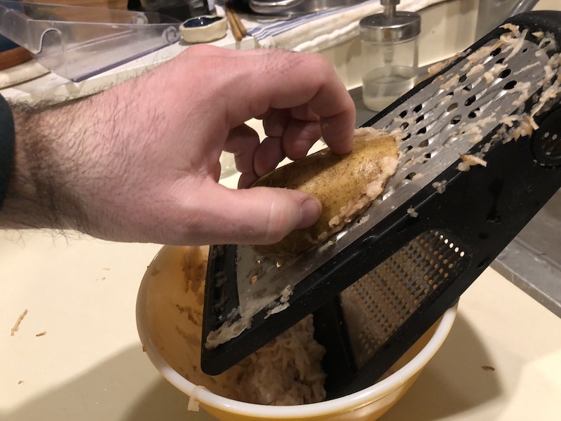 Grate the potatoes. Be careful of your fingers!