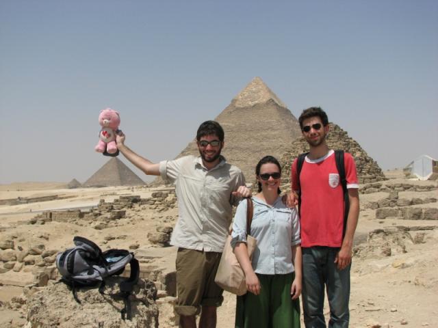 It was hot as ever at the Pyramids, but the excitement of walking around the only remaining ancient wonder made the experience more bearable. We entered into one of the side pyramids made for Khufu’s queen; it was hot and humid, not unlike a sauna, and entirely unremarkable inside. We chose not to stand in line to repeat the experience. A friendly man hanging out with the guards offered to show us some newly excavated tombs, and I agreed without consulting the group. I expected that it would cost some baksheesh, but thought it would be worth it for the experience. He took us far from other tourists, showing us the tomb of the engineer who directed the construction, and that of his family. He reminded us that taking pictures was not allowed, but he would let it be our secret. Then he staged cheesy photographs of us, the Care Bear, and the pyramids behind. These seemed ridiculous at the time, but were totally worth it in retrospect. Then, when we were out of sight of anyone else, he asked for 300 Egyptian pounds, or around $60. This was really out of our price range, and I made a counter offer of L100. He was appalled at my lack of consideration for him and his friends, and he reminded me that this price was for the whole group, not just per person. How generous. We dithered back and forth, and finally convinced him that we are just poor students, and while we appreciated his time, we could only give him L150. He then tried to give us our money back if we were unsatisfied, putting us in the position of demanding that he take at leas some money. Very smart, this guy. We got out of there a little bit poorer, perhaps no wiser but a whole lot more wary.