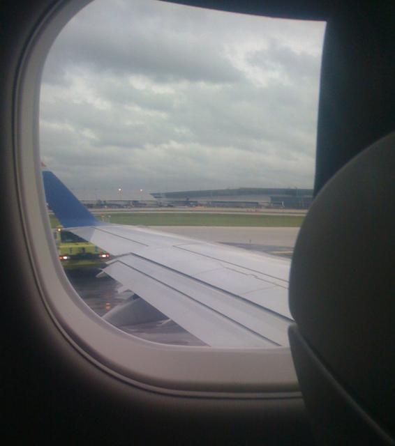 Philly was also experiencing strong crosswinds, so our first approach got down to perhaps 50 feet before the pilot gunned the engine and went around for another try. Again, not out of the ordinary, but when mixed with the previous circumstances, people started to get freaked out. The second landing was trailed by emergency vehicles, and I managed a quick snap of one just off the wing.